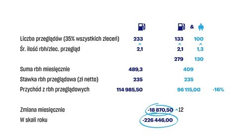Liczba roboczogodzin na zlecenie jest niestety przy „elektryku” niższa (1,3 vs 2,1), co sprawia, że miesięczna liczba roboczogodzin przeglądowych maleje nam z 489 do 409.